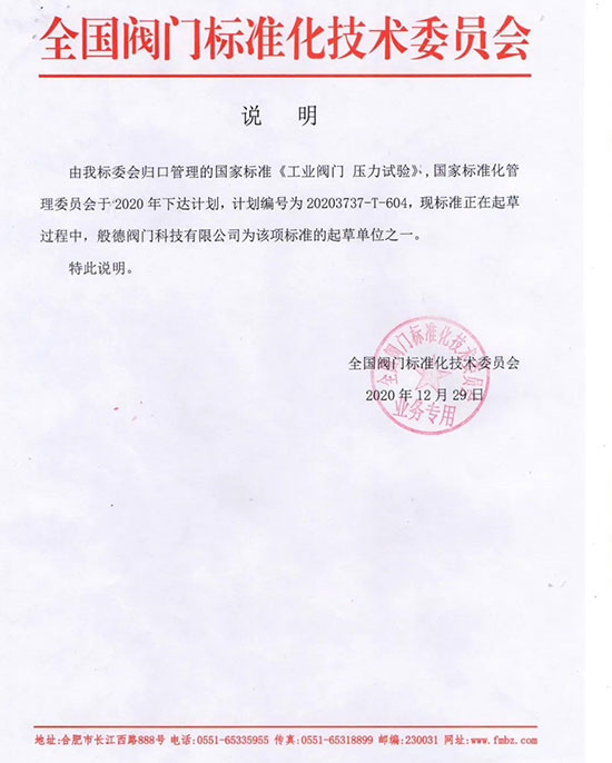圖|般德閥門為國家標準《工業(yè)閥門 壓力試驗》起草單位之一