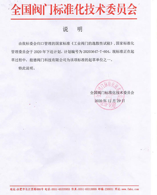圖|般德閥門為國家標準《工業(yè)閥門的逸散性試驗》起草單位之一